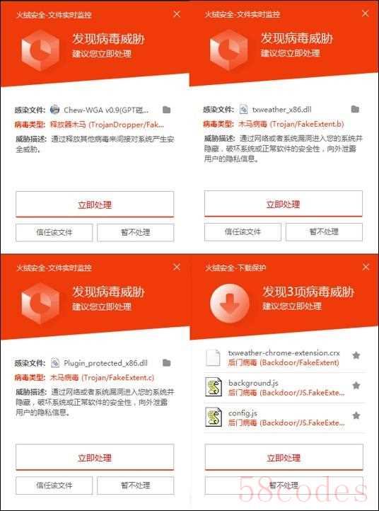 要注意的是,火绒会对整个家族中的病毒模块单独报毒,绝不会错过或者含糊其辞。然后,会将危害最严重的病毒类型作为整个病毒家族的类型。比如下图火绒对FakeExtent病毒家族的不同模块的报毒是不一样的,但最终会将该家族定性为后门病毒。