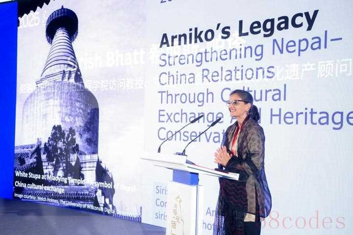 2025白塔夜话现场,加德满都阔帕工程学院访问教授、中国文物保护基金会文化遗产顾问希丽斯·帕塔分享尼泊尔与白塔寺的历史渊源。西城区文化与旅游局供图(2025年9月26日摄)