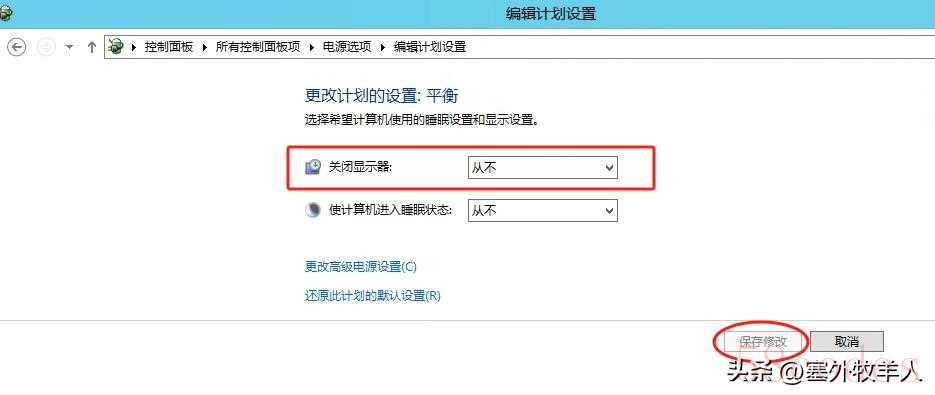 “关闭显示器”和“使计算机进入睡眠状态”都选“从不”,然后“保存修改”