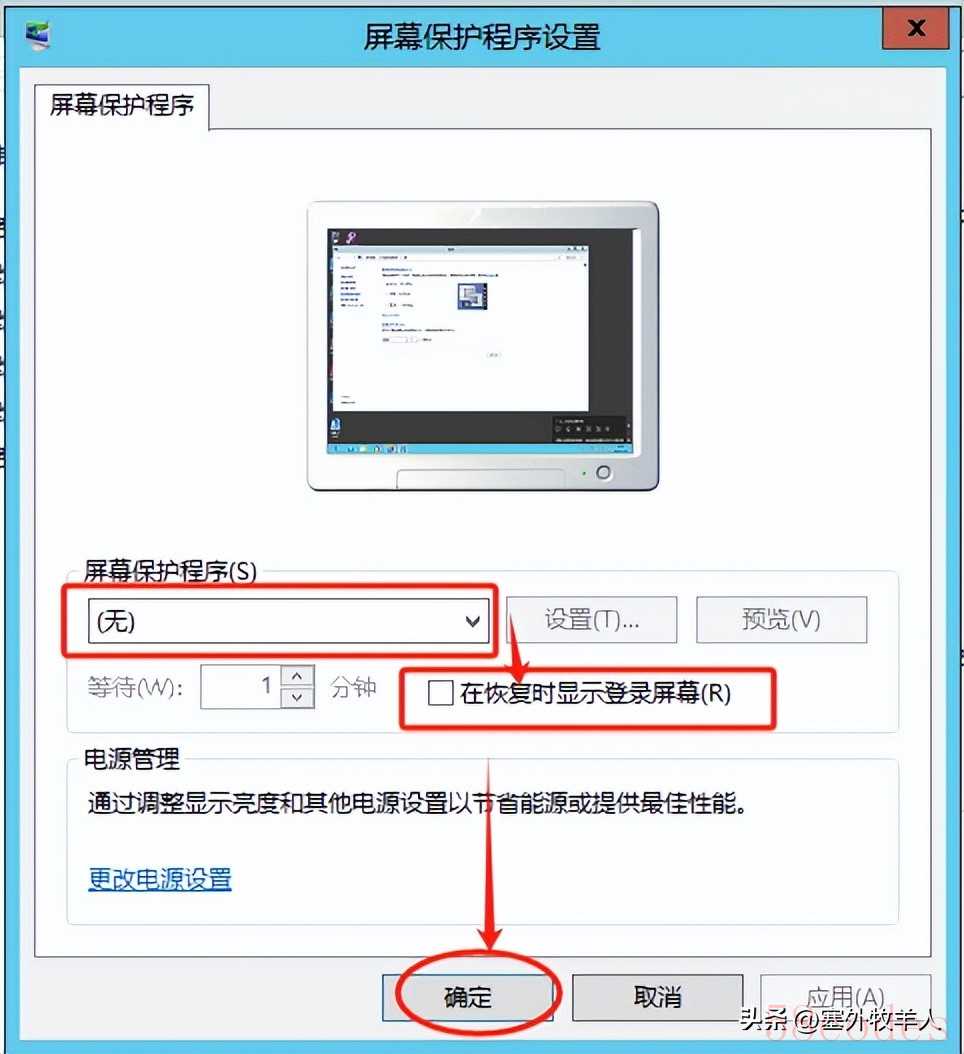 屏幕保护程序选“无”,去掉“在恢复时显示登录屏幕”之前的勾,然后“确定”。