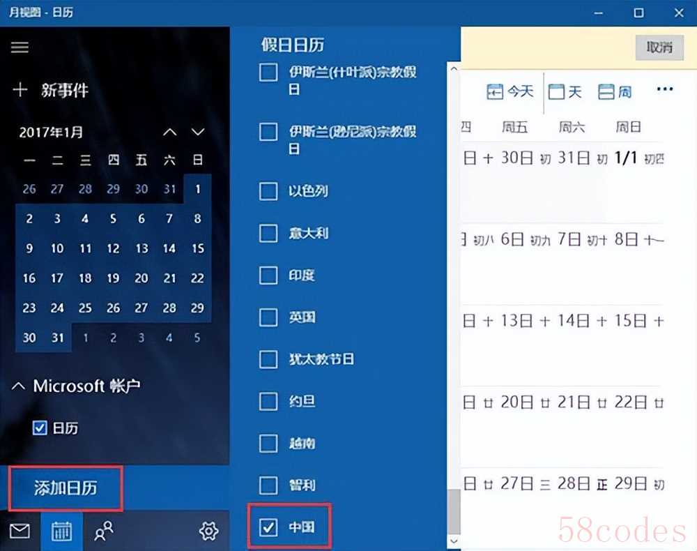 3、除了农历外,新版还可以设置显示各国的假日日历,方法为点击上图中的“添加日历”,然后选择国家。如图所示: