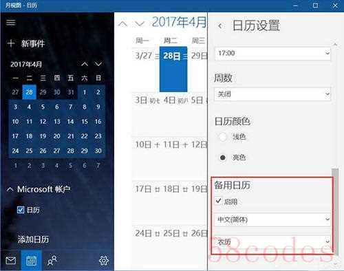 2、在这里可以找到备用日历,勾选“启用”,选择中文(简体)以及农历。如图所示:
