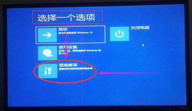 (2)运行到“选择一个选项”界面时,请选择下面的【疑难解答】选项。