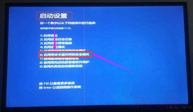 (6)运行到“启动选项”界面时,请选择下面的【带命令提示符的安全模式】选项,根据上面提示按6或者F6键。