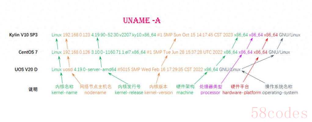 uname(unix name),Kylin / UOS / CentOS 等 Linux 各版本通用命令,用于查看电脑和系统信息,如处理器类型,内核版本等。