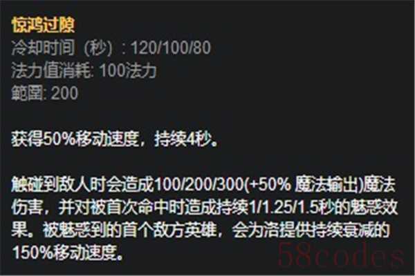 洛的R技能开启后会提供50%的加速,在魅惑到敌人时还会提供逐渐衰减的150%的移速加成,这样洛可以在团战中的移速提升巨大,存活率提高的同时也可以产生更大的控制范围。