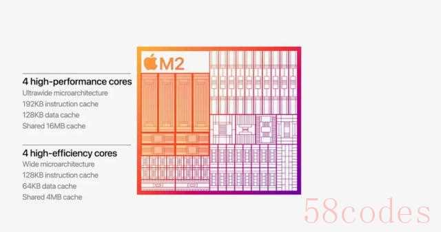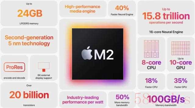 M2芯片采用了5nm制程,集成了200亿个晶体管,较M1多了20%。统一内存的带宽达到了100Gbps,容量也高达24GB,性能和能效核心都得到了更新。