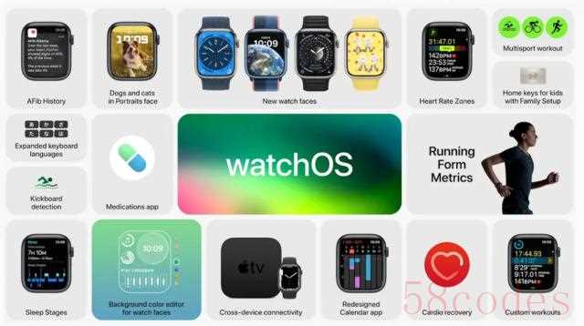 watchOS9使用三个新的跑步形式指标以跟踪佩戴者的跑步效率,可以追踪佩戴者的跑步姿态、步幅、以及地面接触时间。另外,watchOS9还支持CustomWorkouts(自定义训练计划)。