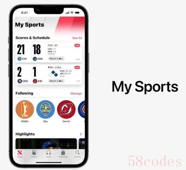 iOS16新增了运动方面的功能,主要包括AppleTV应用中的LiveActivity可显示体育信息(比分和赛况等),AppleNews则可以聚合来自多家媒体的体育内容。