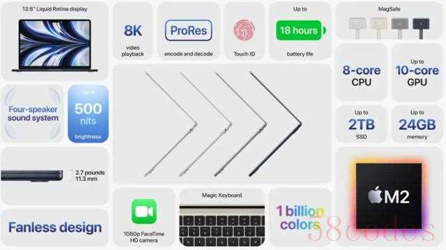 这次发布会最大的亮点之一就是全新设计的MacBook Air。这款笔记本采用了全新的紧凑型设计,更窄的边框和更轻薄的机身,使其看起来更加时尚和便携。更重要的是,它搭载了两款全新的M2芯片:M2和M2 Pro。