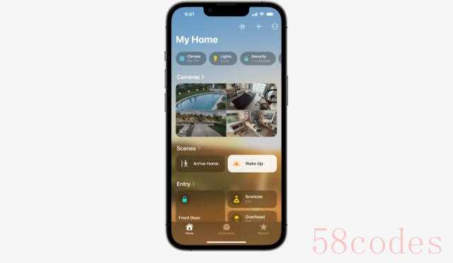 苹果支持Matter智能家居协议标准,并在iOS16中改版了Home应用,主选项卡上就提供了房间与收藏板块,且有气候、灯光、安全等新类别,还可以看到各个家庭摄像头捕捉的画面。