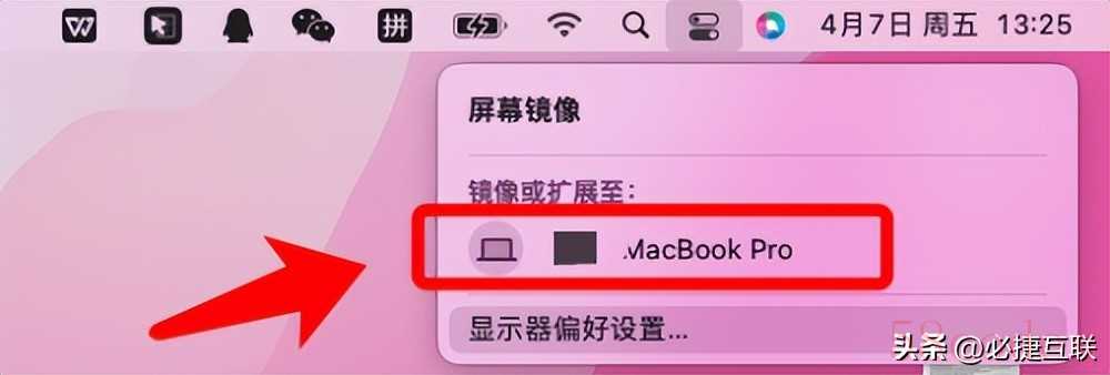 - 或者直接点击顶部菜单栏的“控制中心”,选择“屏幕镜像”,然后在“镜像或扩展至”下,选择一个显示器。
