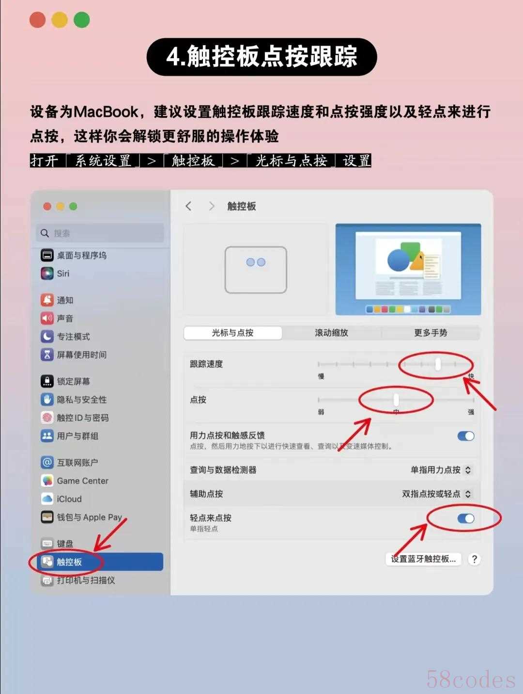 调整触控板的跟踪速度、点按强度和轻点设置,能让操作更舒适。打开「系统设置」>「触控板」>「光标与点按」,根据自己的习惯调整参数,解锁更丝滑的操作体验。