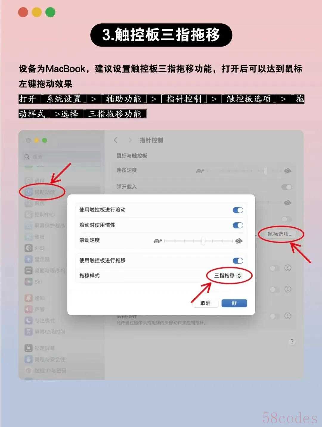 用MacBook的话,建议设置触控板三指拖移功能。打开「系统设置」>「辅助功能」>「指针控制」>「触控板选项」>「拖动样式」,选择「三指拖移功能」,就能实现类似鼠标左键拖动的效果,操作文件更方便。