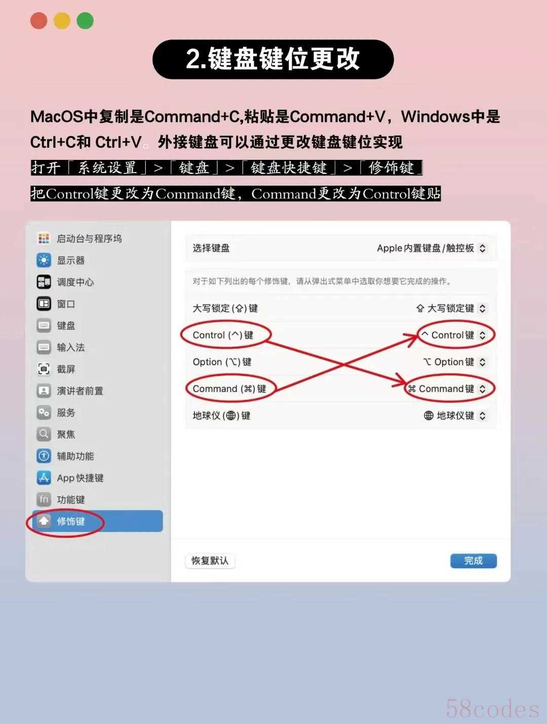 Mac的复制粘贴是Command+C和Command+V,和Windows的Ctrl+C、Ctrl+V不同。外接键盘可以打开「系统设置」>「键盘」>「键盘快捷键」>「修饰键」,把Control键和Command键互换,这样就能用熟悉的Ctrl快捷键了。