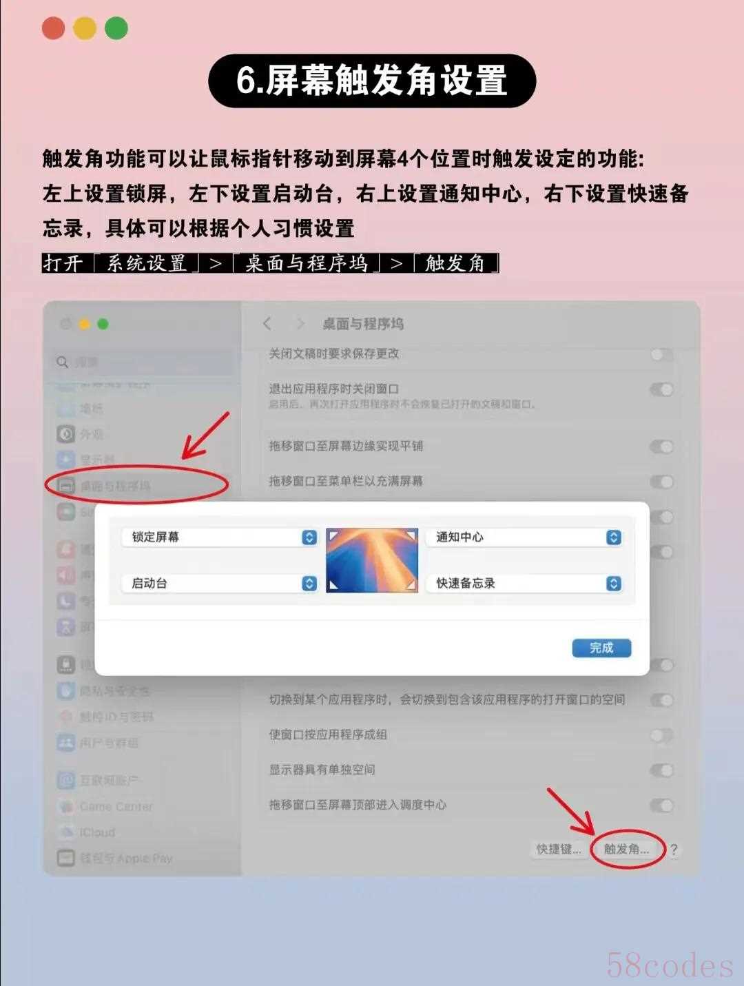 利用屏幕触发角功能,鼠标移到屏幕四个角落就能触发不同功能,比如左上锁屏、左下启动台、右上通知中心、右下快速备忘录,根据自己的习惯设置,效率瞬间拉满。