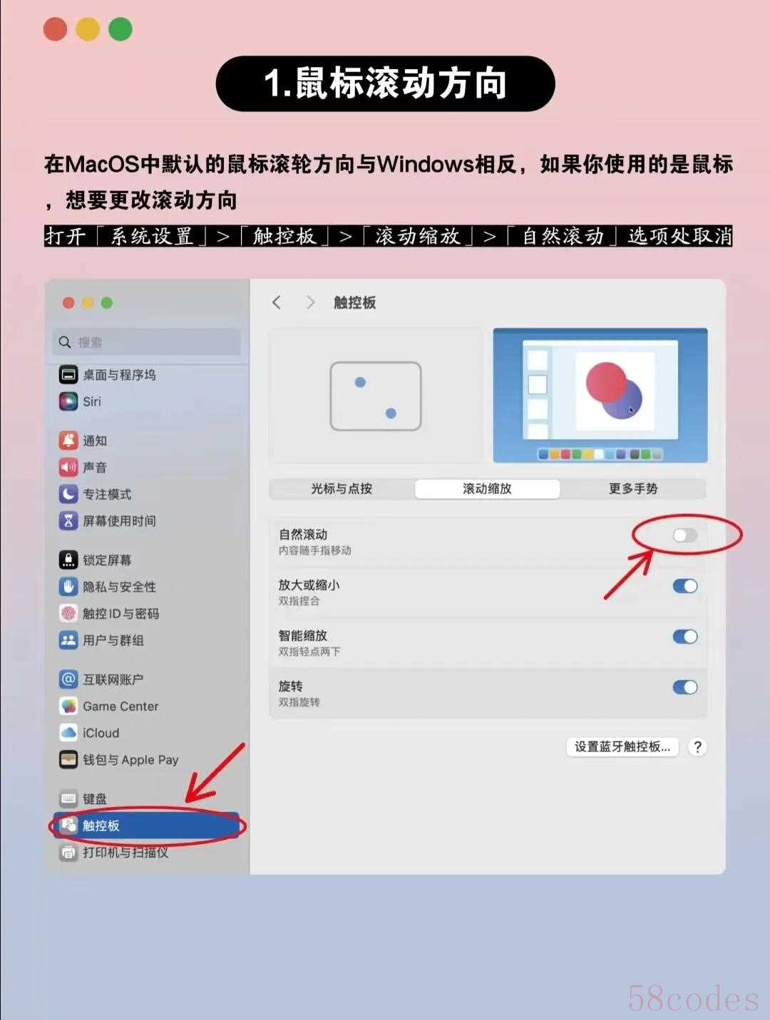 MacOS默认鼠标滚轮方向和Windows相反,用着很别扭。打开「系统设置」>「触控板」>「滚动缩放」,取消「自然滚动」选项,滚动方向就和Windows一致了,操作起来更顺手。