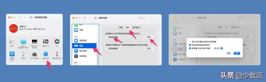 macOS 自带的屏显键盘操作功能隐藏得比较深,需要用户自动手动开启;使用过后需要手动关闭。步骤:依次通过系统偏好设置 > 辅助功能 > 键盘硬件 > 选项开启。注意勾选「启用粘滞键」,然后检查右侧「选项」中的「在屏幕上显示按下的键」。