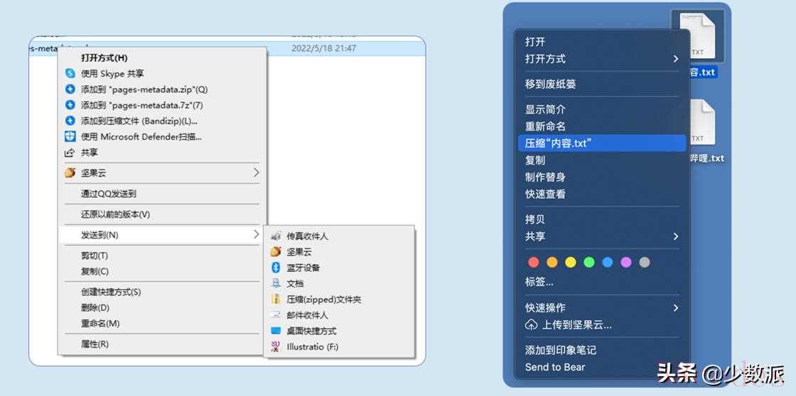 在 Windows 系统当中,在文件上按右键时,会出现一个发送到「压缩(zipped)文件夹」的选项。macOS 下的压缩功能本身与 Windows 系统自带的功能相似,用法也是类似,在文件上右键出现压缩功能。不管是 Windows 还是 macOS,系统默认的压缩最终的结果都是一个 zip 包。