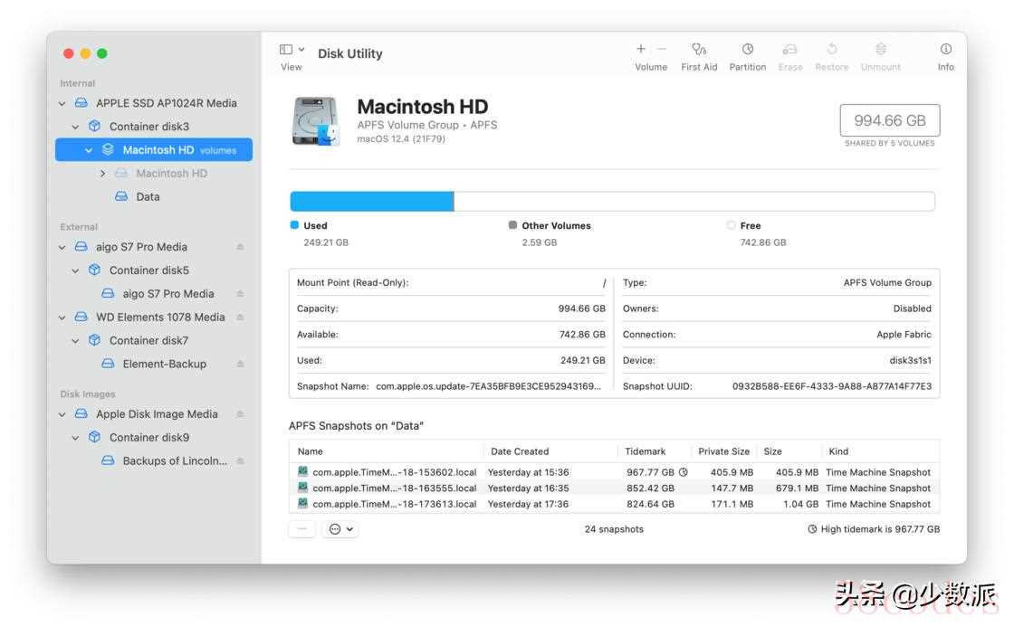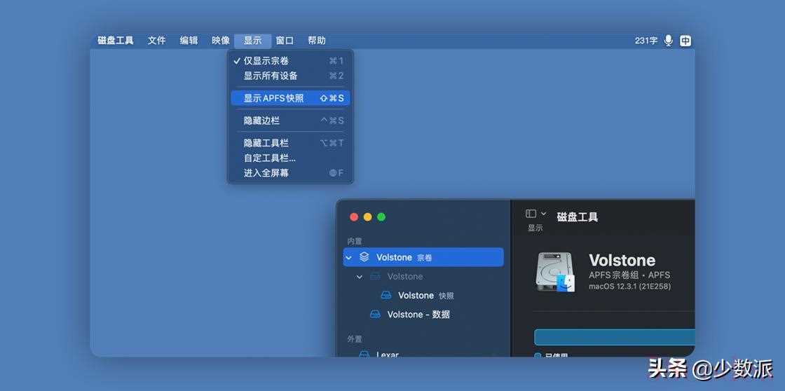 在上文关于压缩归档中,我提到了 APFS 的问题。APFS 是苹果文件系统(Apple File System)的简称,它使用在 macOS、iOS、tvOS 和 watchOS 上。APFS 针对闪存和固态存储设备进行优化,具有写入时复制等设计特点。macOS 会在特定时间点创建父 APFS 宗卷的只读副本,这个只读副本就是 APFS 快照。用户可以在 Mac 上查看一系列 APFS 快照,拷贝有关快照的信息和删除快照。此前,查看 APFS 快照的方式对于小白来讲很不友好,需要要去终端中,通过输入命令的方式才能看到。现在 macOS 提供了更为简单的方法,而且也可以显示出更多的参数信息。步骤:启动台 > 磁盘工具 > 显示 >「显示 APFS 快照」,然后选择相应的「宗卷」这样就会看到来自时间机器和全盘备份克隆创建的 APFS 快照。