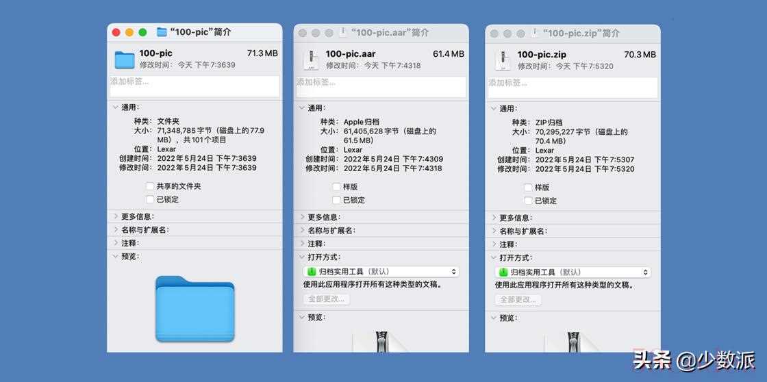 相比传统的压缩方式,使用 Apple 归档进行压缩时相比右键压缩速度更快,压缩出来的文件体积更小。这里有一张我压缩了 100 个文件的对比图。