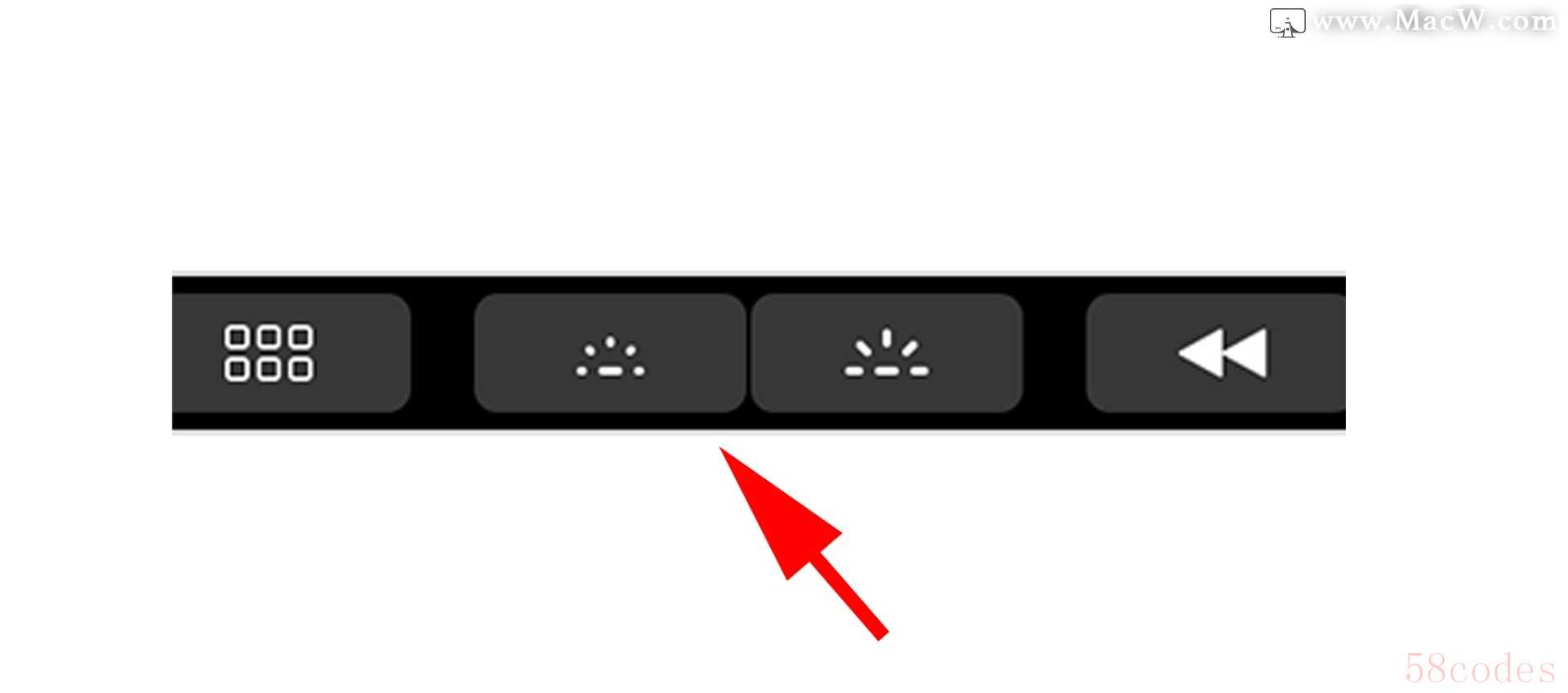 对于带有触摸栏的Mac,您需要查找下面显示的两个符号,它们看起来像一条水平线,上面有五个点或新月形的线。点用于降低光线,而线则使它们发光。
