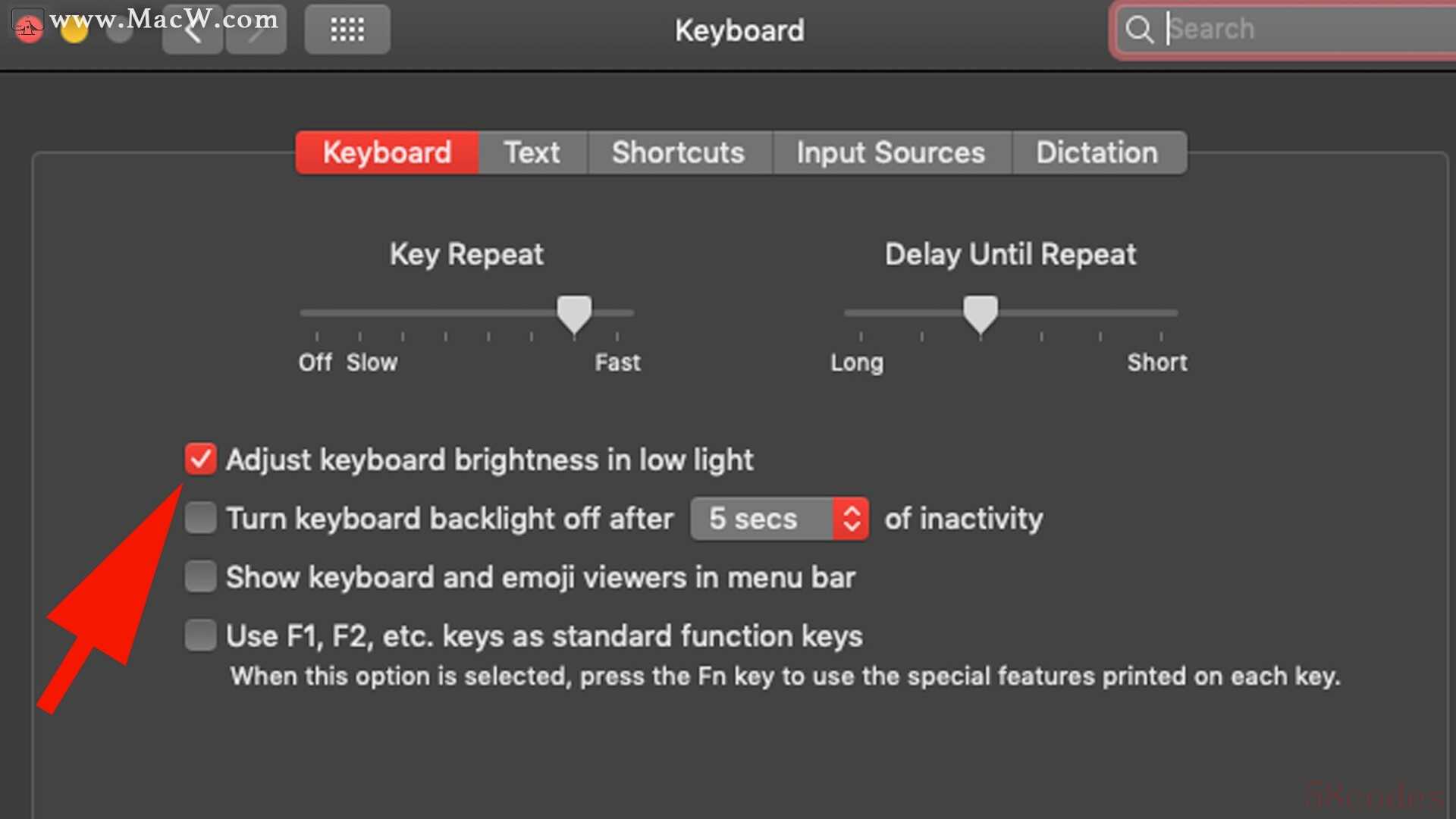 点击键盘选项卡,取消勾选“在弱光下调整键盘亮度”选项,完成后,使用上面提到的方法关闭背光。当然,如果您想重新打开设置,只需返回“系统偏好设置”的“ 键盘”选项,然后再次启用它即可。