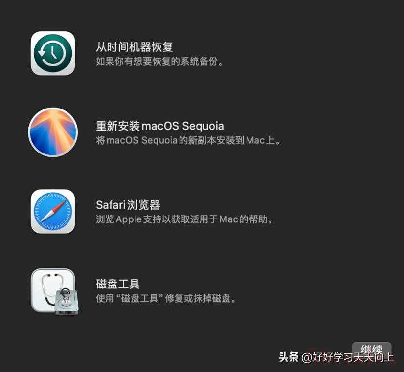 - 在“macOS 实用工具”窗口中,选择“磁盘工具” -> “继续”。