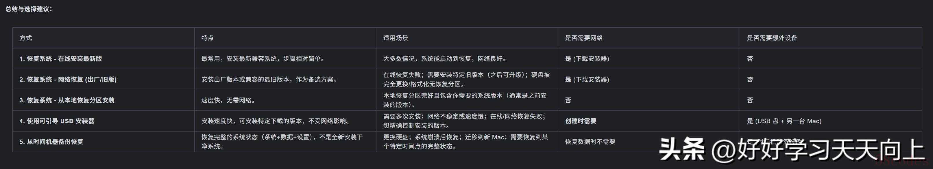 - 版本兼容性: 安装的 macOS 版本必须与你的 Mac 硬件兼容。恢复系统通常会提供兼容的最新版本。USB 安装器需要你下载对应兼容的版本。
