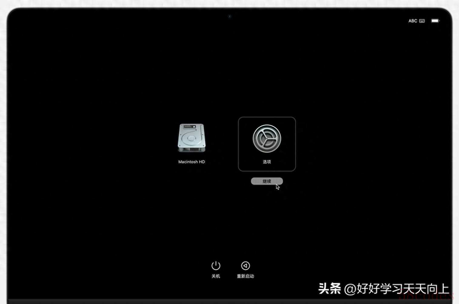 - Apple Silicon (M1/M2/M3 等) Mac: 关机。按住电源按钮不放,直到看到启动选项屏幕(显示齿轮图标和“选项”字样)。选择“选项”,然后点“继续”。