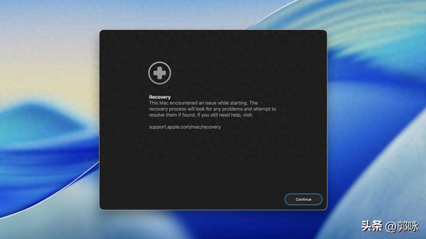 当 Mac 在启动过程中检测到异常情况时,电脑可能会自动重启并进入恢复助手。用户只需在窗口中点击“继续”按钮,并按照屏幕提示完成后续步骤,即可开始恢复流程。