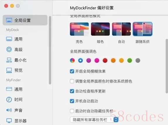 初次打开mydockfiner就也可以对其进行设置,在全局设置中开启“myfiner”、“开机自动启动”,在通用中调整图标大小外,其余设置基本可以跳过。