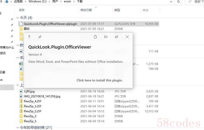 另外,如果需要预览word、Excel、PPT等文件则需要从github上安装插件。在下载好插件后,空格预览,点击安装后重新启动quicklook即可。