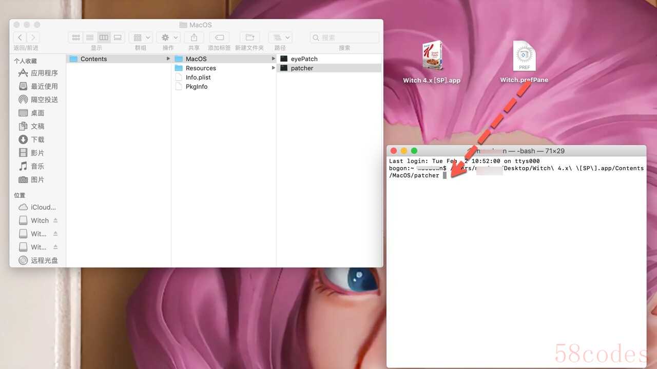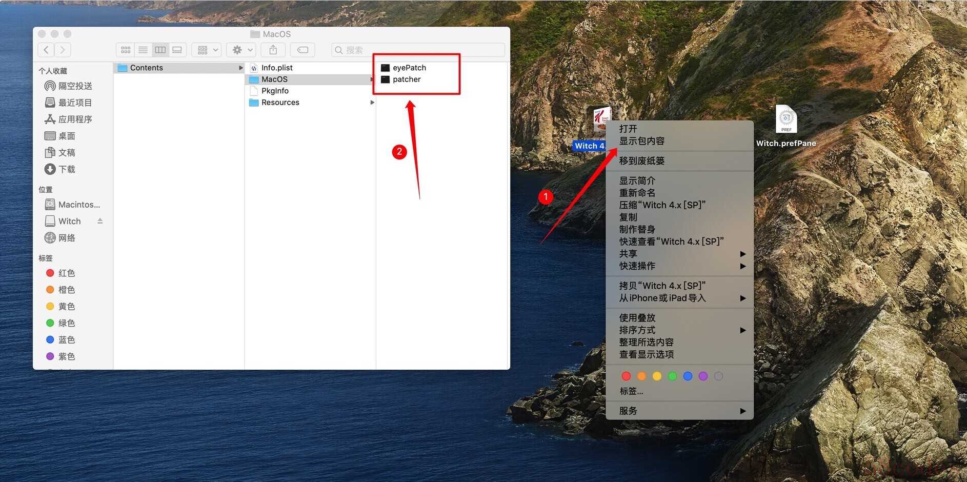 右键打开Witch 4.x ——显示包内容——Contents——MacOS文件夹里找到eyePatch和patcher文件!