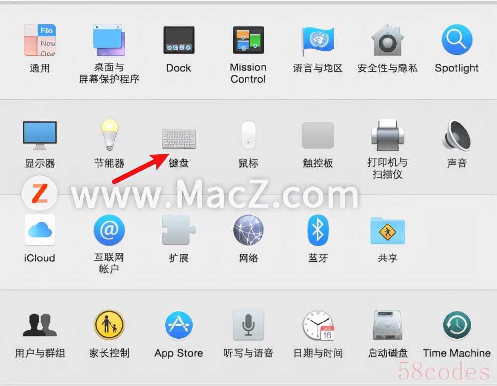 1.打开“系统偏好设置”,点击下图图中箭头所指的“键盘”选项。