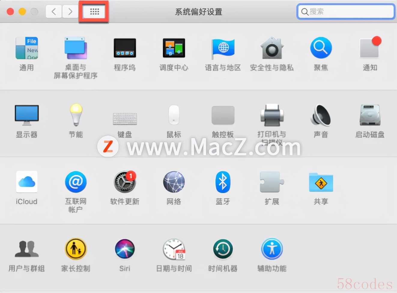 1.打开【系统偏好设置】,长按红框内的这个按钮,就是“全部显示”的按钮。