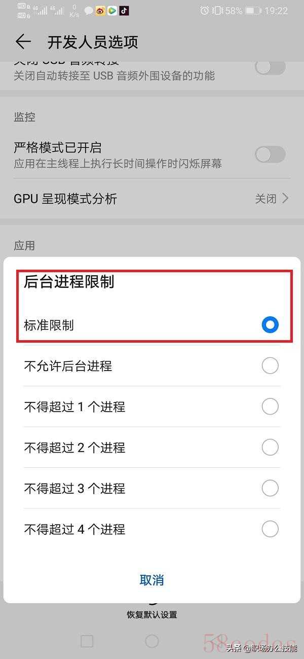 在“开发人员选项”中还有一个“限制后台进程”的功能,设置好了之后,手机后台只允许限制个数值的应用开启。这样可以为手机省电不少,还能避免手机发热。