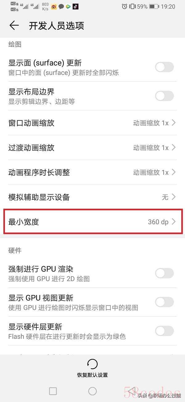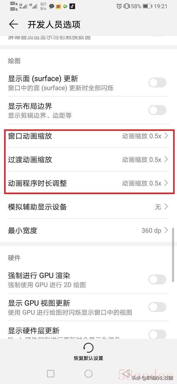 下图中的动画缩放,其默认值是1x,我们可以把它设置为0.5x。因为这个数值是手机的最舒服状态,设置好了之后,也能够提升手机的流畅程度