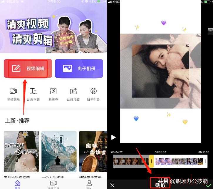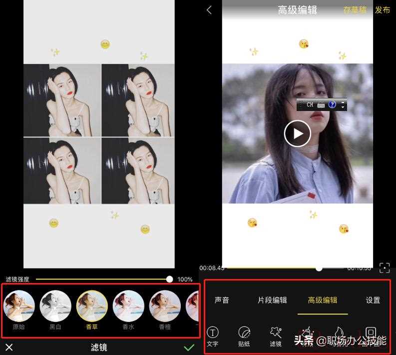 除此之外,里面还有很多实用的功能,像给视频添加字幕、添加滤镜、音乐、特效等,都是可以的。而且一键就能搞定,十分简单。