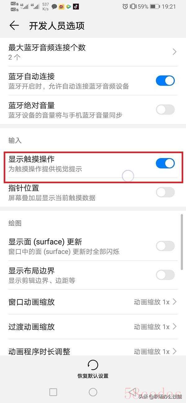 如果我们不小心摔了手机,想知道屏幕有没有损坏的话,可以打开“开发者选项”中的“显示触摸操作”。开启之后,手指点到哪里,就会自动检测屏幕的状态,图中的圆点位置就是检测屏幕情况的。
