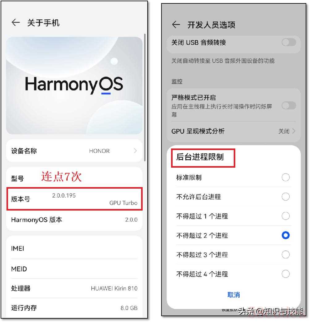 操作方法:打开【设置】-【关于手机】,连续点7次版本号,进入开发者模式。返回【系统和更新】,点击【开发人员选项】拉到最后,找到【后台进程限制】-【不得超过4个进程】。