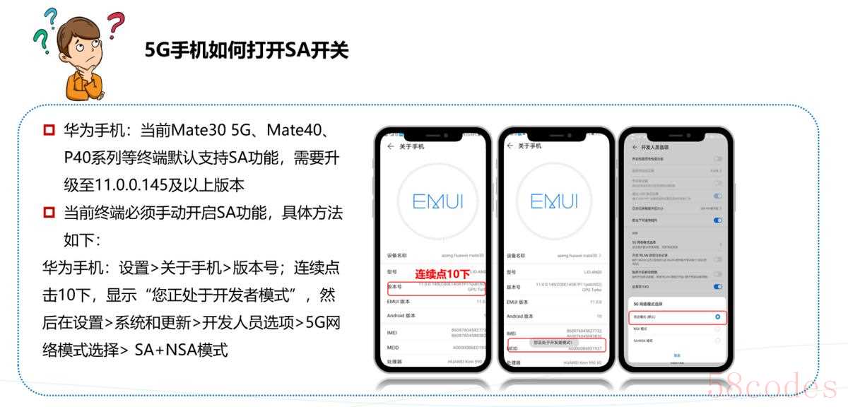 手机如何打开5G网络且选择SA或者NSA模式呢?以华为MATE30pro手机为例,启用5G功能设置路径为:设置>无线和网络>移动网络>关闭/启用5G;选择SA或者NSA功能设置路径为:设置>关于手机>版本号;连续点击10下,显示“您正处于开发者模式”,然后在设置>系统和更新>开发人员选项>5G网络模式选择> SA+NSA模式 或者SA模式。