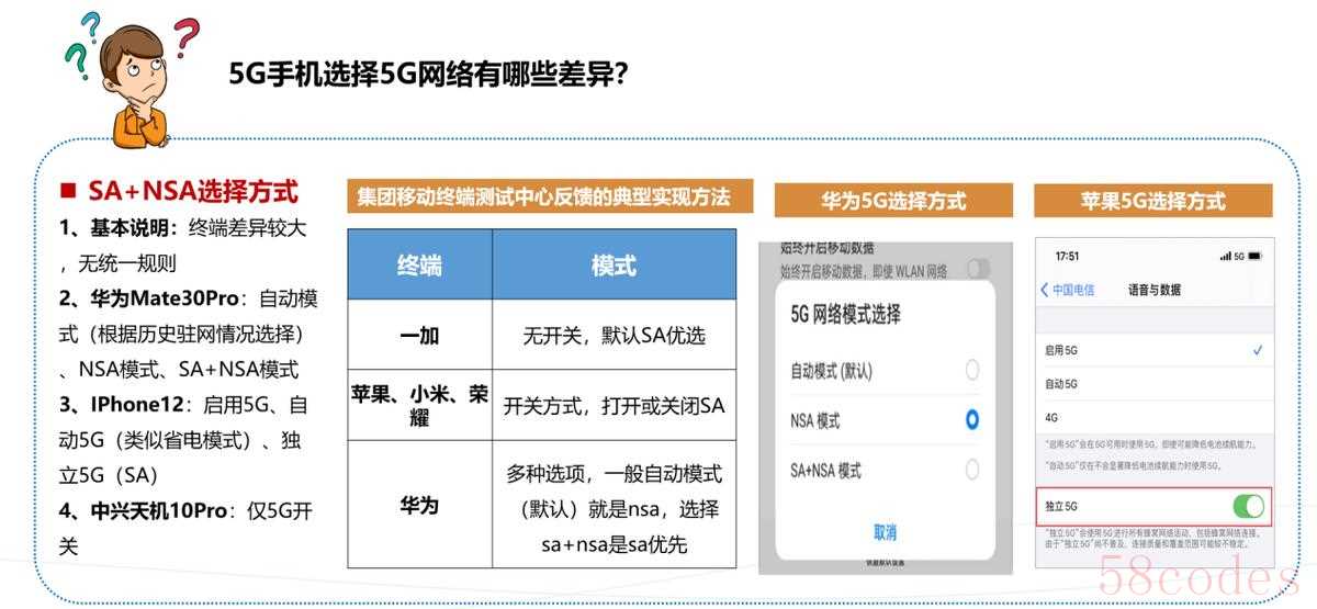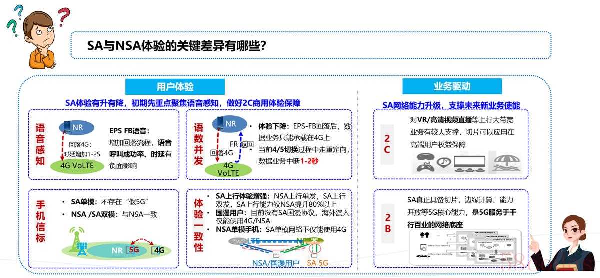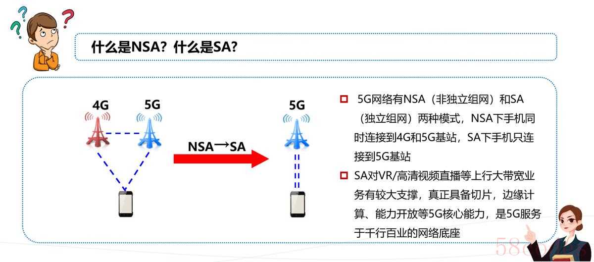 电信的5G网络有SA模式和NSA模式,当手机设置成SA模式时上网带宽更大和时延更低,缺点是当打电话时回落到CDMA 1X或者4G VoLTE,导致语音呼叫成功率低和拨打电话寻呼时延增大,但是随着逐渐建设完善由5G SA网络承载语音业务的VoNR,这个缺点将会得到解决;NSA模式优点是NSA 用户始终连接4G ,始终保证业务连续性,缺点是带宽只有SA模式的一半。