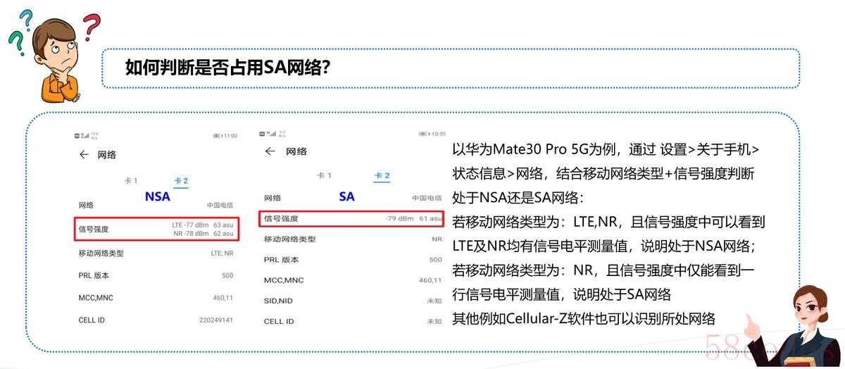 如何判断手机是NSA模式还是SA模式?如下图以华为Mate30 Pro 5G为例,通过 设置>关于手机>状态信息>网络,结合移动网络类型+信号强度判断处于NSA还是SA网络。若移动网络类型为:LTE,NR,且信号强度中可以看到LTE及NR均有信号电平测量值,说明处于NSA网络;若移动网络类型为:NR,且信号强度中仅能看到一行信号电平测量值,说明处于SA网络。