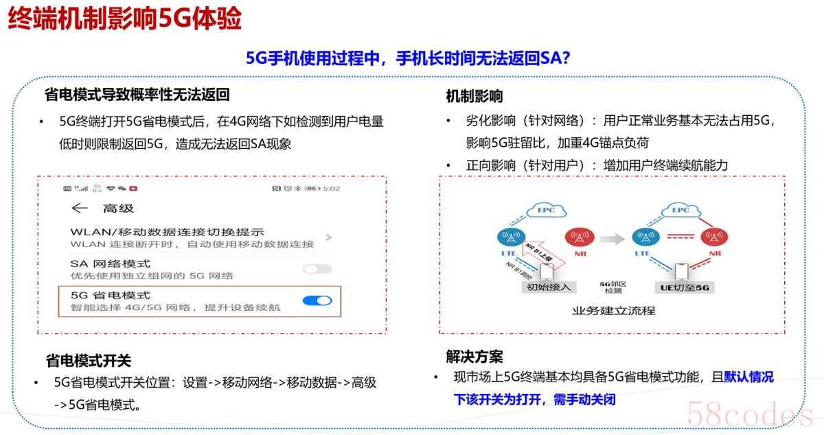 5G手机打开5G省电模式后,在4G网络下如检测到用户电量低时则限制返回5G。5G省电模式开关位置路径:设置->移动网络->移动数据->高级->5G省电模式。