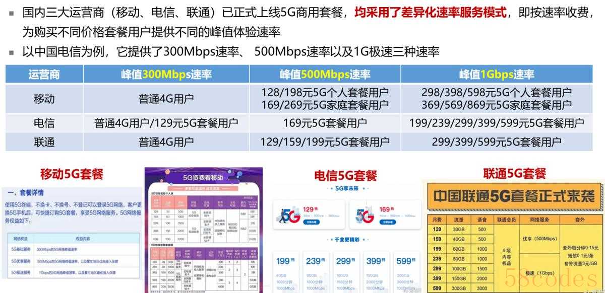 影响5G上网带宽的除了信号覆盖强弱,还有与手机卡的套餐选择也有关。国内三大运营商(移动、电信、联通)已正式上线5G商用套餐,均采用了差异化速率服务模式,即按速率收费,为购买不同价格套餐用户提供不同的峰值体验速率,以中国电信为例,它提供了300Mbps速率、 500Mbps速率以及1G极速三种速率。