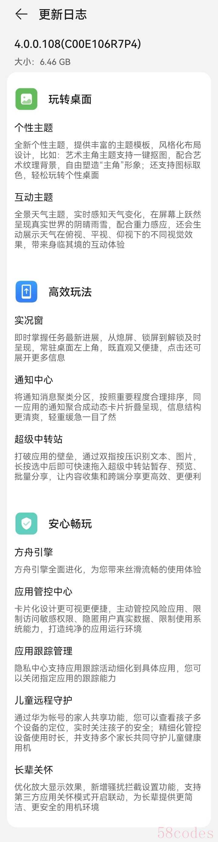从网友提供的截图可见,该机型获推的更新总大小为 6.51GB,版本号为 4.0.0.108。对比 8 月 4 日部分华为门店内体验机型的更新来看,版本号一致,但更新包大小要“瘦了一圈”。