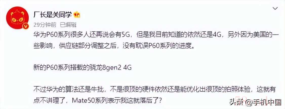 根据相关数码博主的爆料,明年华为P60系列可能依然是4G网络。由于受到了一些其他方面的影响,华为的供应链进行了部分调整,但是这并没有影响到P60系列的进度。这也就是说,P60系列应该会照常发布。