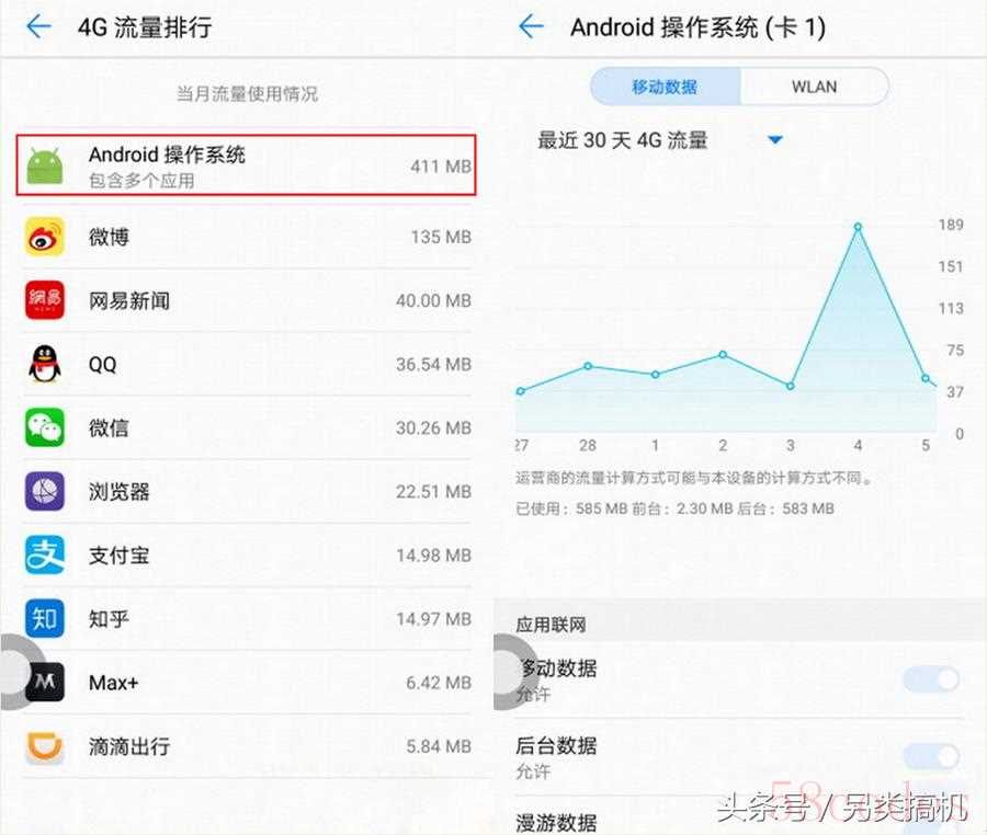 后面对比了同事的另一部华为Mate 9手机,他的手机目前的系统也是华为EMUI5.0最新系统,同样也出现这个问题,这部手机近一个月的时间里“Android操作系统”竟然跑了411MB的流量,这就比较尴尬了,对于手机用户来说流量非常宝贵,那都是“真金白银”呀!