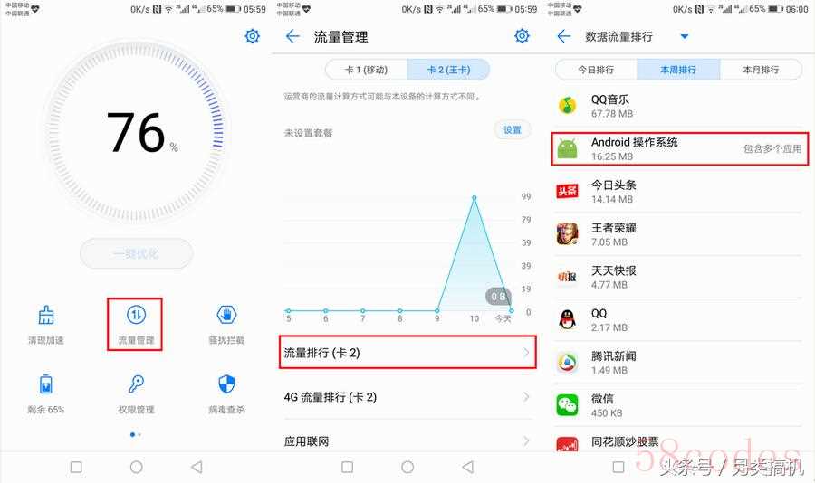使用过程中无意发现有那么几天智能手机的4G网速有点慢,但流量却跑了好多,这是什么情况?于是就慢慢找原因,打开“手机管家”应用并进入到“流量管理”界面,其中的“流量排行”列出了数据流量的使用情况,可以发现“Android操作系统”是耗流量的大户,一天中就跑了16.25MB。